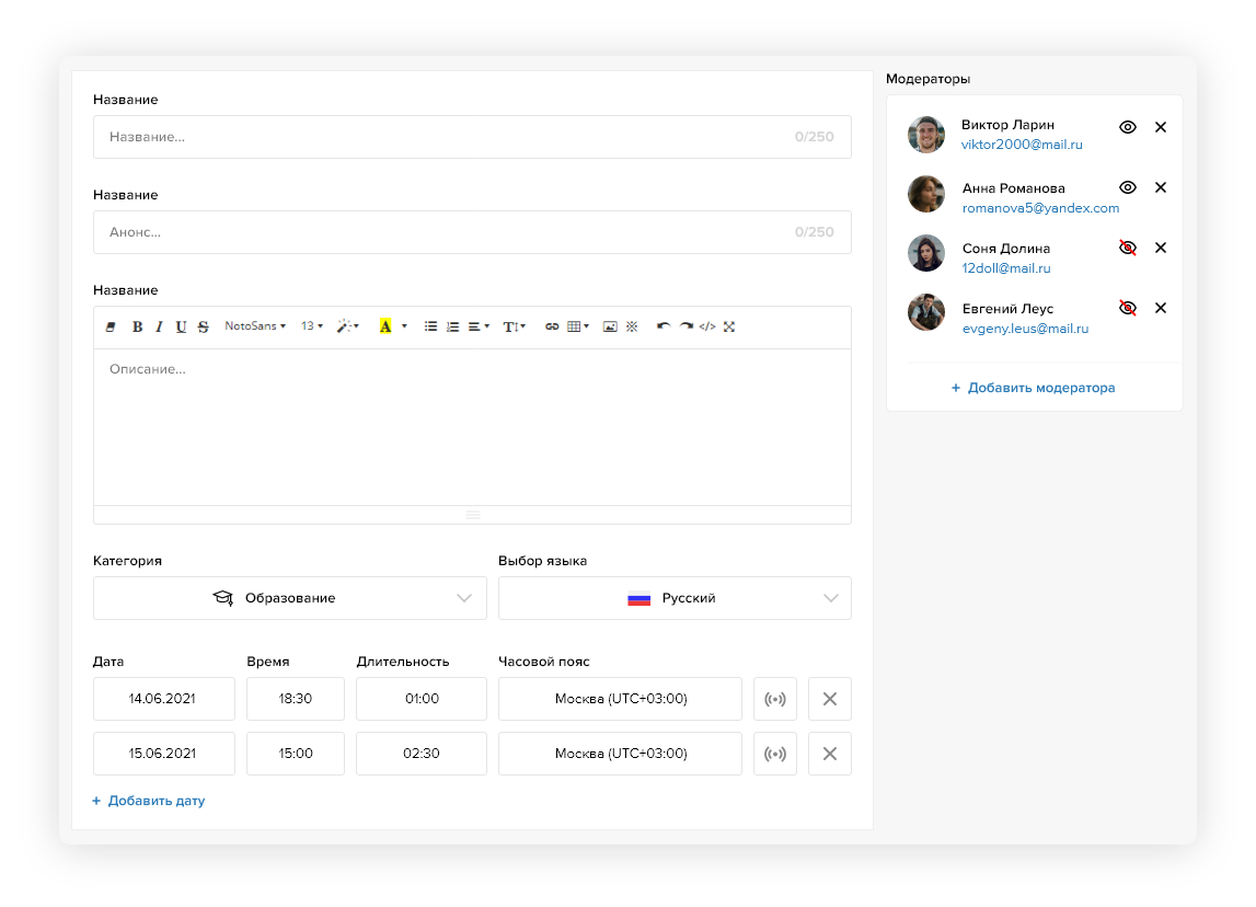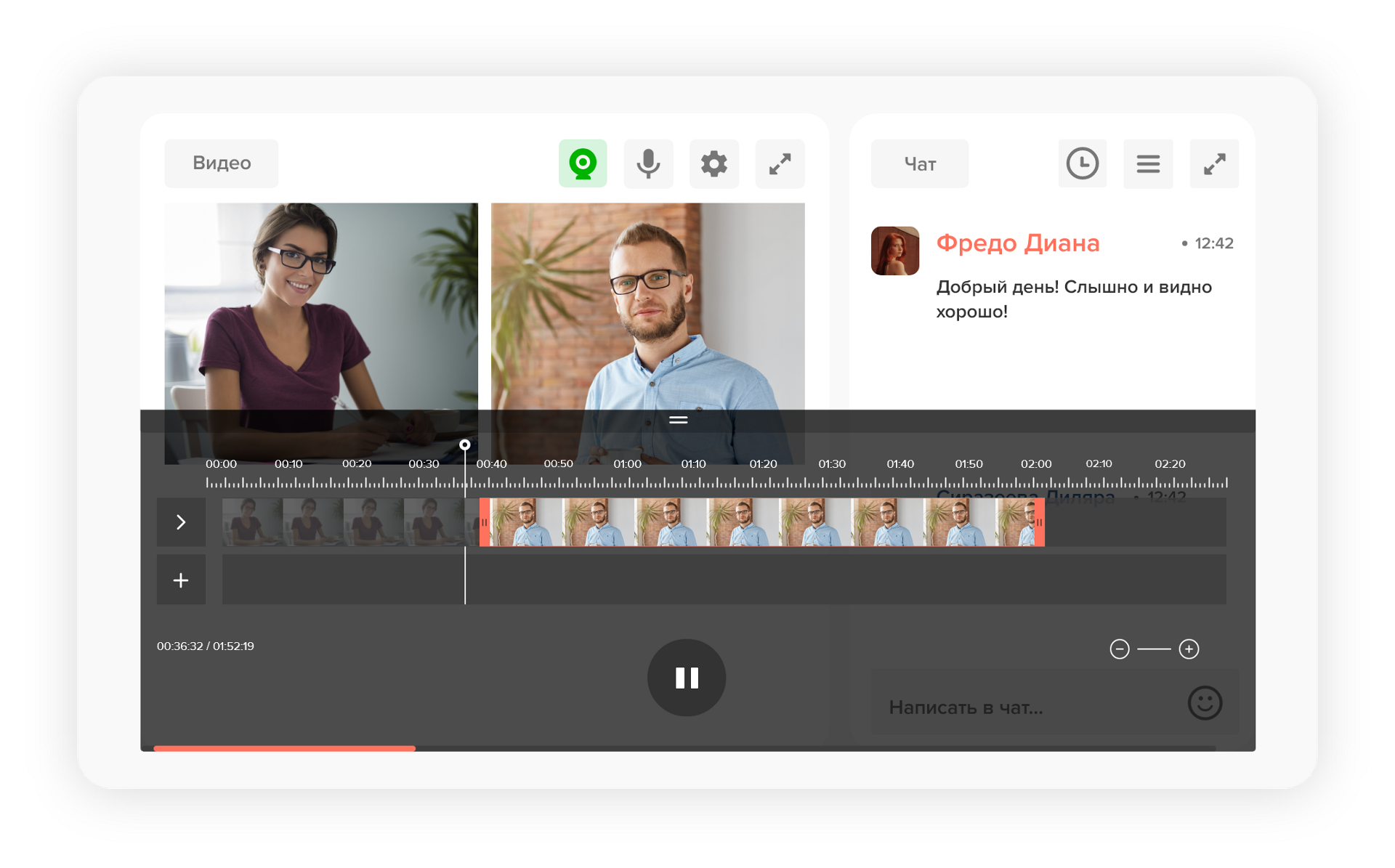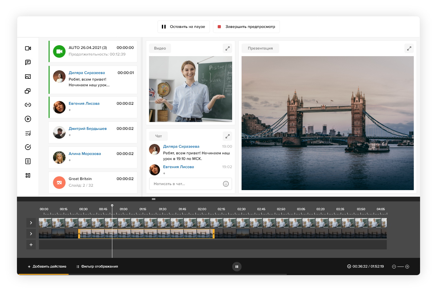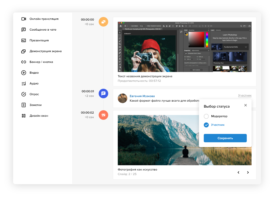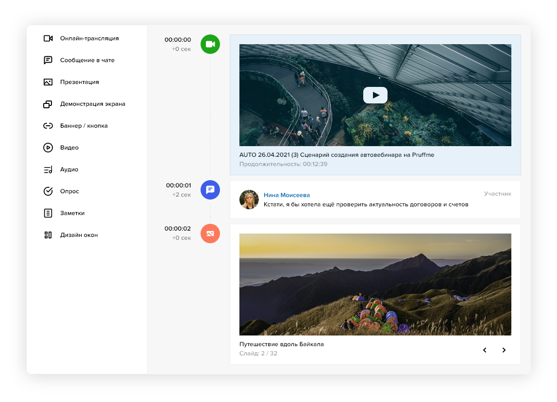Не обязательно проводить живую трансляцию — создавайте автовебинар с 0! Наполняйте сценарий любыми элементами с помощью простого и лаконичного редактора.